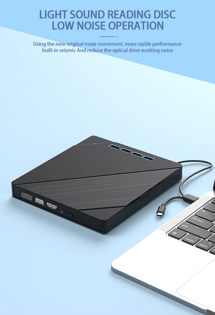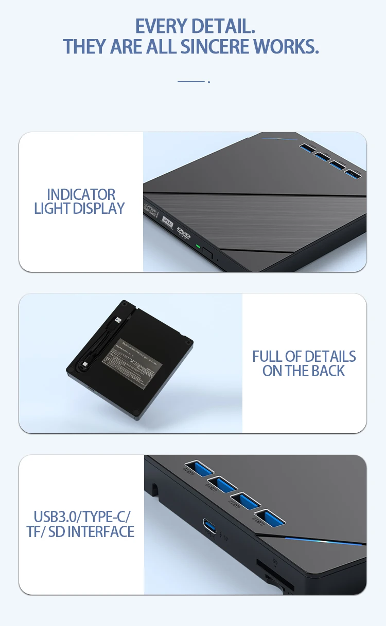 7 1 Multifunctional DVD Burner for Laptop 3 USB Ports TYPE-C Interface SD/TF Card Slots 8x/24x Speed 4MB Cache Hidden Data Cable
